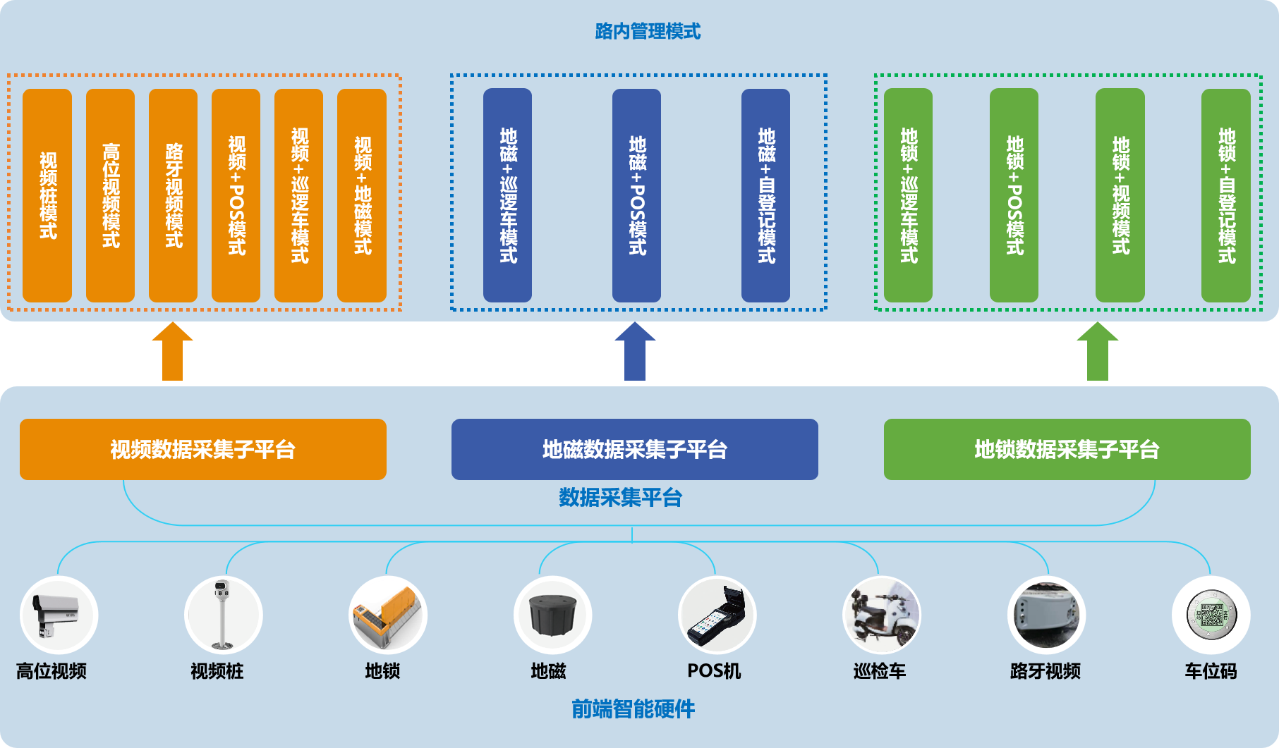 基于前端智能设备建设的路内停车解决方案,支持地磁、高位视频、视频桩、路牙视频、地锁、巡检车、POS移动端等多类型智能设备数据接入,经数据采集平台对采集数据的汇聚、业务场景整合,实现多种路内智慧停车管理模式,包括地磁+POS模式,地磁+巡逻车模式,高位视频+巡逻车模式,高位视频+POS模式等。