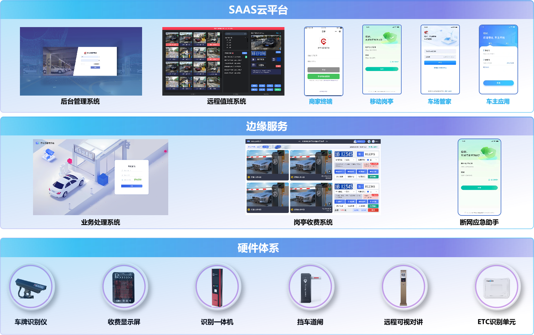 为停车场提供软硬件一体智能化解决方案,实现停车场资源、前端设备、通行规则、计费标准的统一配置管理。支持软件平台Saas服务功能,运营单位无需单独部署平台,依托JDB电子停车场运营管理Saas平台,实现停车场的集约化管理。